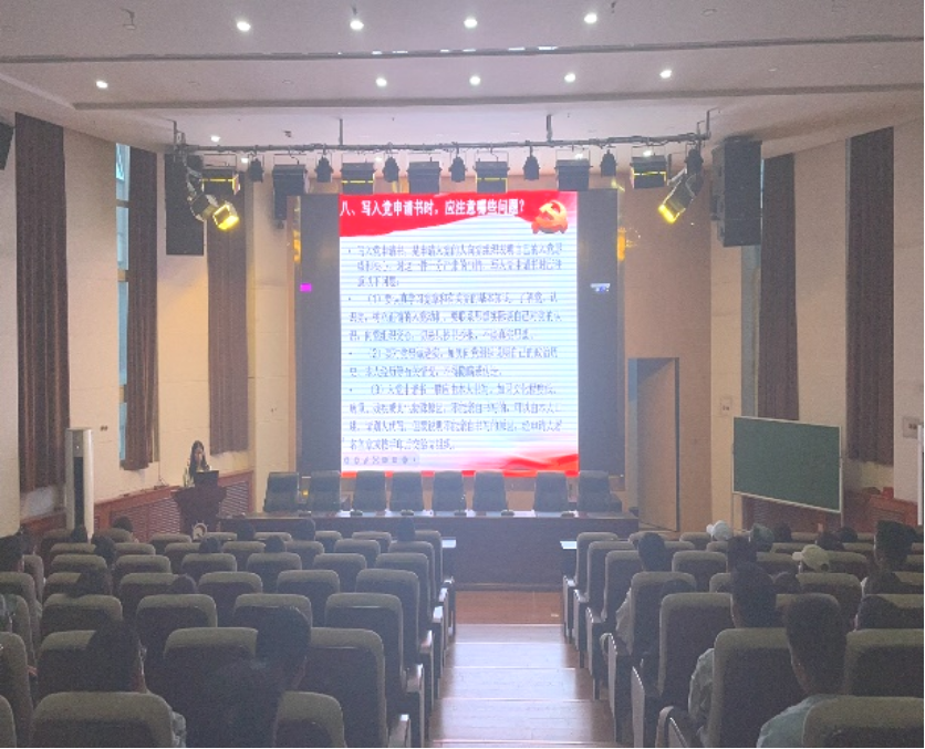 支部书记王雅丽同志结合当前国内外政治形势,特别是习近平总书记系列重要讲话精神,从“当代大学生必须确立马克思主义的科学信仰”入手,围绕党的性质和宗旨,引导学生思考我们为什么要加入中国共产党。同时,支部成员韩秀云同志详细解读了发展党员的程序和标准,讲解了“怎样做才能加入中国共产党”,深入浅出地为新生普及了党的基本知识和在大学生中发展党员的相关政策,为学生加入党组织明确目标、指明方向。
