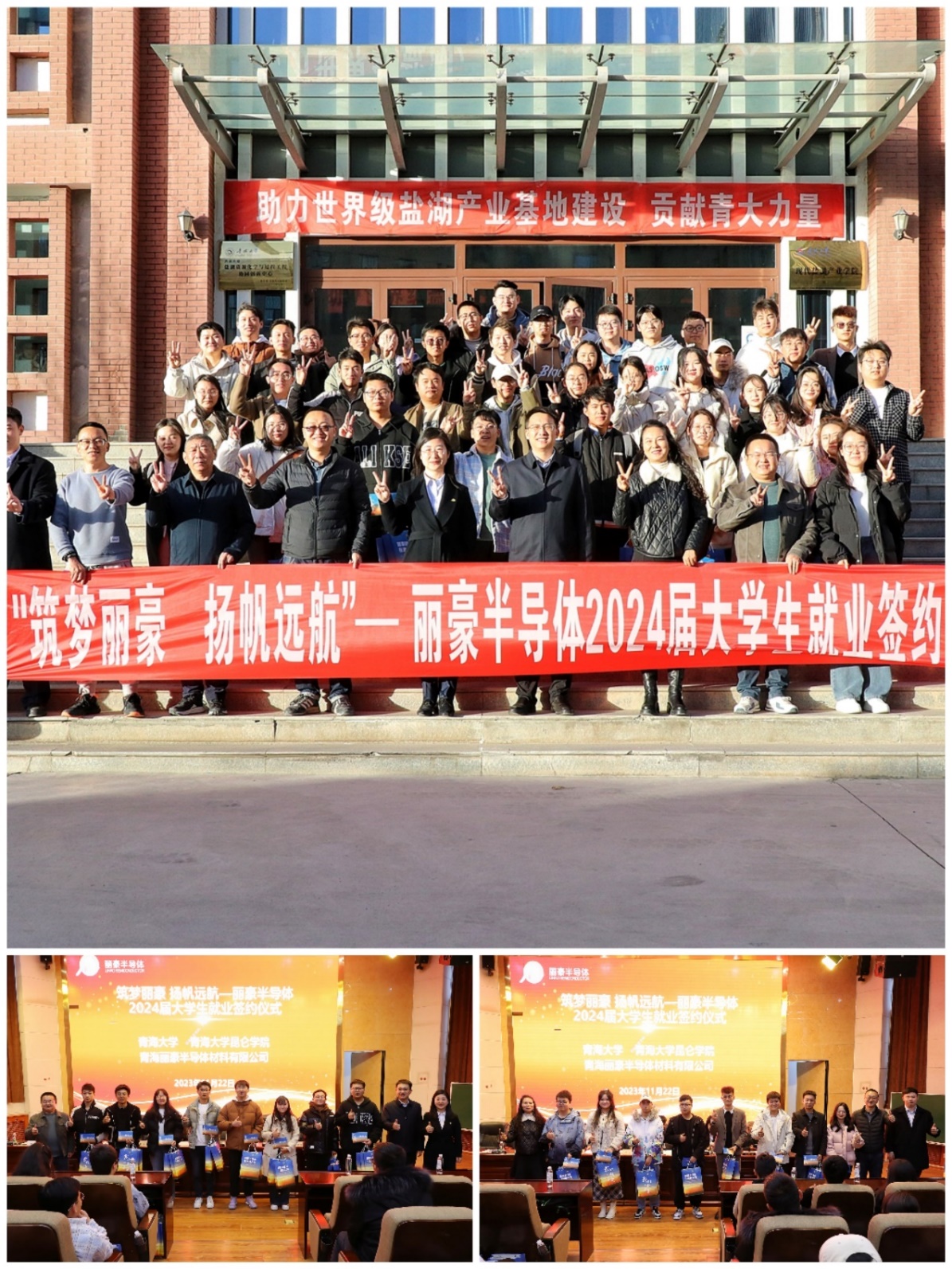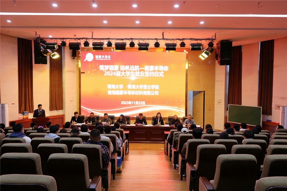11月22日下午,海角视频 在一楼学术报告厅举行“筑梦丽豪 扬帆远航”—2024届丽豪半导体大学生就业签约仪式。青海丽豪半导体材料有限公司综合部部长黄亚丽、校学生处副处长李小安、昆仑学院副院长赵克俭、学院院长刘大欢和相关院系师生共50余人参加了签约仪式,仪式由青海丽豪半导体材料有限公司综合部文志成主持。