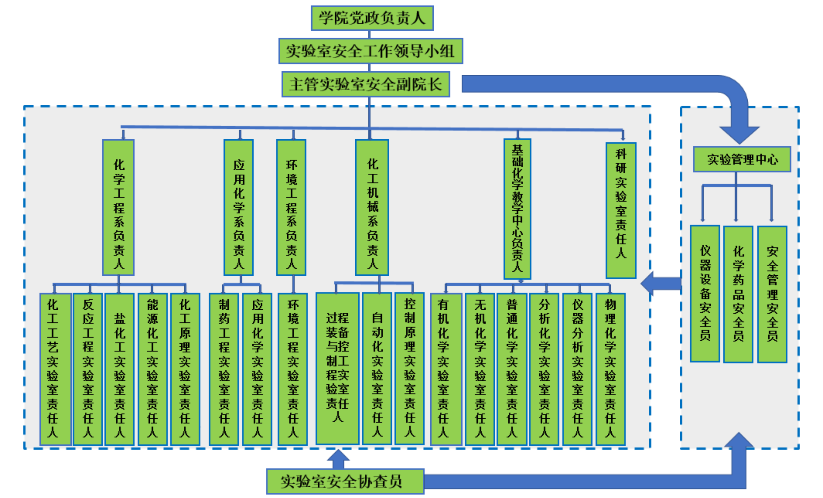 1.学院党政负责人是实验室安全工作第一责任人,全面负责实验室安全工作。其主要职责为建立实验室安全责任体系,组织成立实验室安全领导工作小组,落实实验室安全分管领导和实验室安全负责人等人员;制定本单位的实验室安全工作计划并组织实施;落实实验室安全设施建设、改造与实验室安全管理的资金。